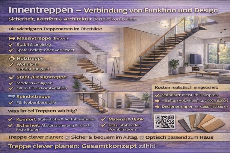 Innentreppen – Verbindung von Funktion und Design Die Innentreppe ist weit mehr als nur ein Weg ins nächste Geschoss.Sie ist ein zentrales Gestaltungselement und wird täglich genutzt. 👉 Die richtige Treppe verbindet Sicherheit, Komfort und Architektur Welche Treppenarten gibt es?…
